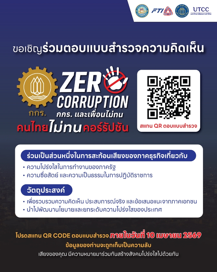 ขอเชิญท่านร่วมตอบแบบสำรวจความคิดเห็นของภาคเอกชนเกี่ยวกับความโปร่งใสในการปฏิบัติราชการของภาครัฐ เพื่อสำรวจความคิดเห็นและประสบการณ์ของภาคเอกชน ต่อความโปร่งใส ความซื่อสัตย์ และความเป็นธรรมในการปฏิบัติราชการของหน่วยงานภาครัฐ และเพื่อรวบรวมข้อเสนอแนะจากภาคธุรกิจ