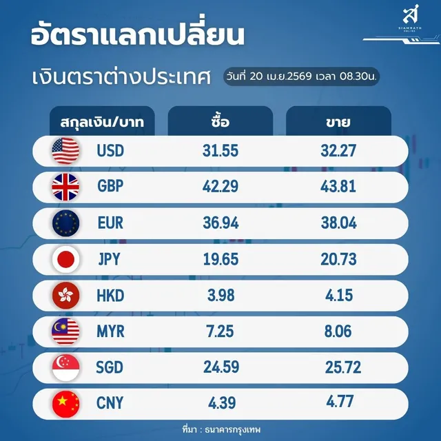 อัตราแลกเปลี่ยนเงินตราต่างประเทศวันนี้ 20 เมษายน 2569