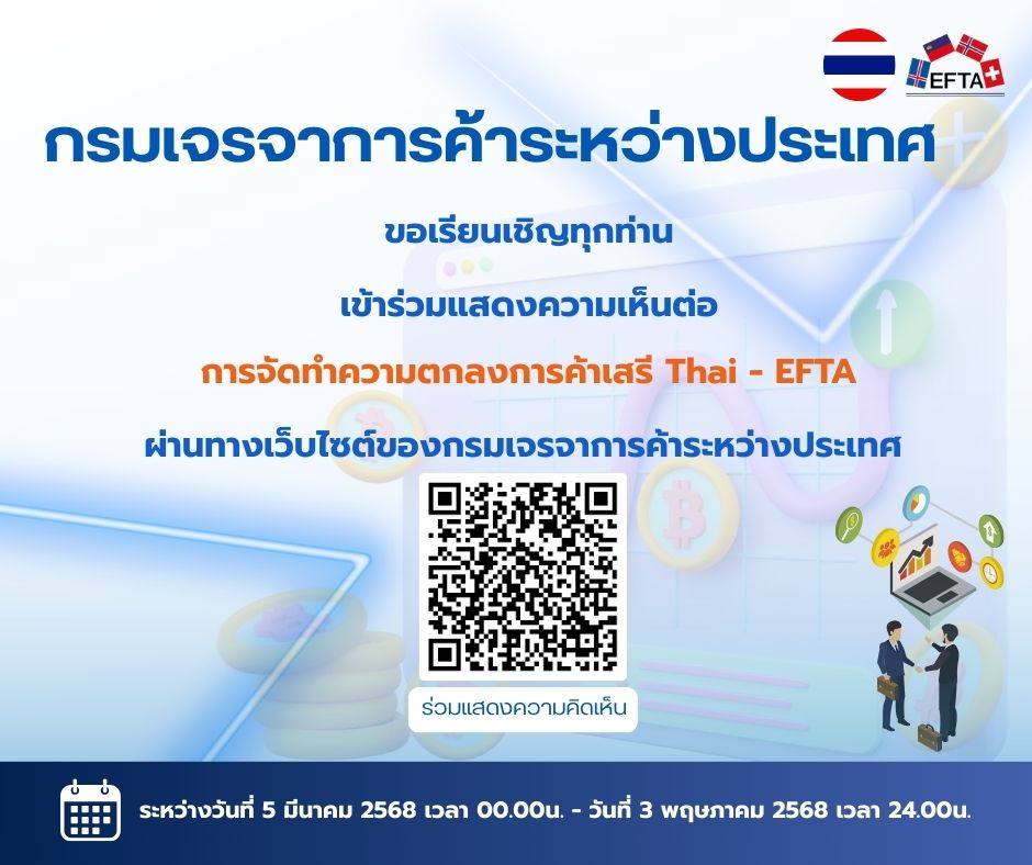 ขอเรียนเชิญทุกท่าน เข้าร่วมแสดงความเห็นต่อการจัดทำความตกลงการค้าเสรี Thai- EFTA ผ่านทางเว็บไซต์ของกรมเจรจาการค้าระหว่างประเทศ https://www.dtn.go.th/th/eform2/category/form/id/15/cid/15/iid/112