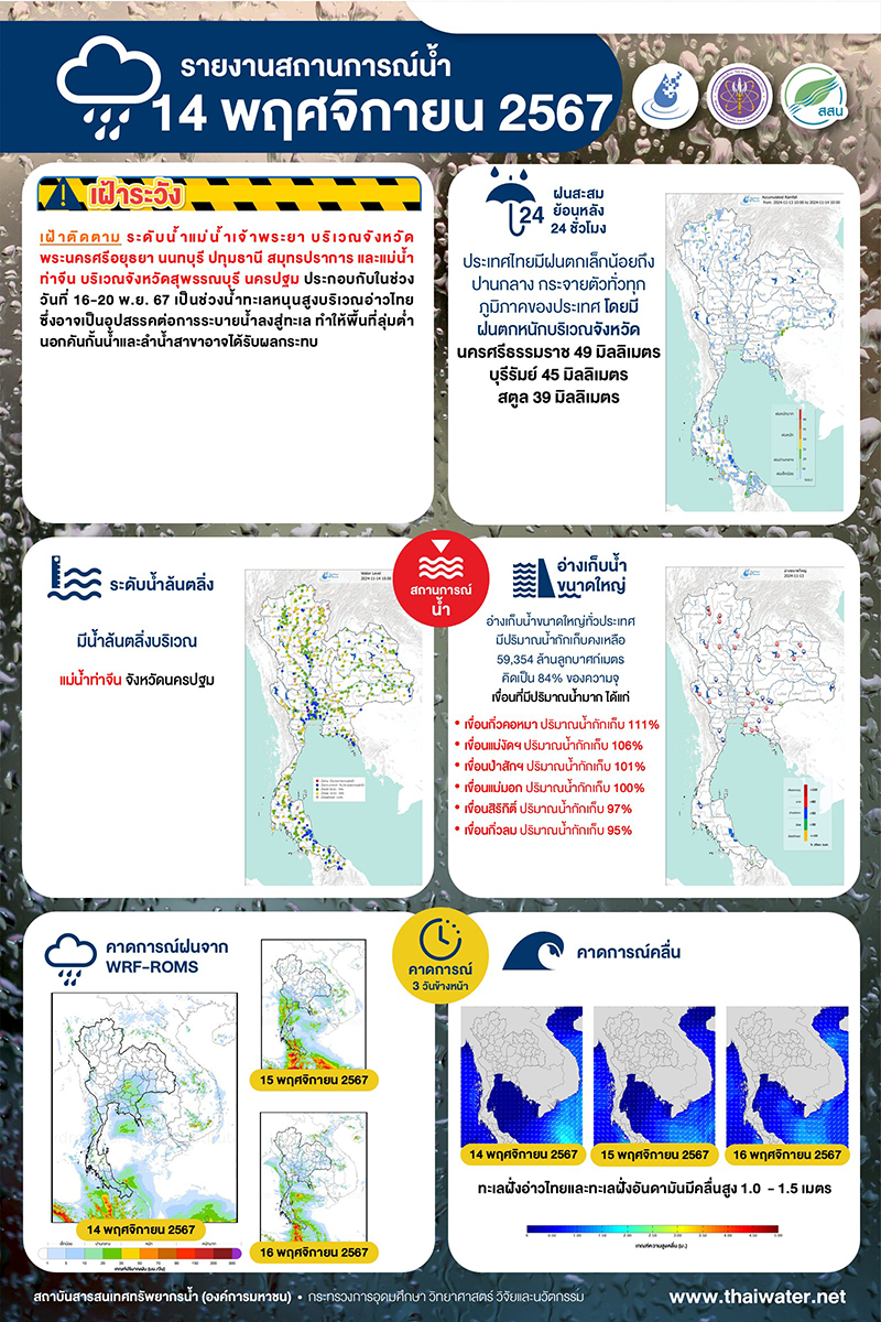 เฝ้าติดตาม ระดับน้ำเจ้าพระยา บริเวณจังหวัดพระนครศรีอยุธยา นนทบุรี ปทุมธานี สมุทรปราการ และแม่น้ำท่าจีน บริเวณจังหวัดสุพรรณบุรี นครปฐม ประกอบกับในช่วงวันที่ 16-20 พ.ย. 67 เป็นช่วงน้ำทะเลหนุนสูงบริเวณอ่าวไทยซึ่งอาจเป็นอุปสรรคต่อการระบายน้ำลงสู่ทะเล ทำให้พื้นที่ลุ่มต่ำนอกคันกั้นน้ำและลำน้ำสาขาอาจได้รับผลกระทบ