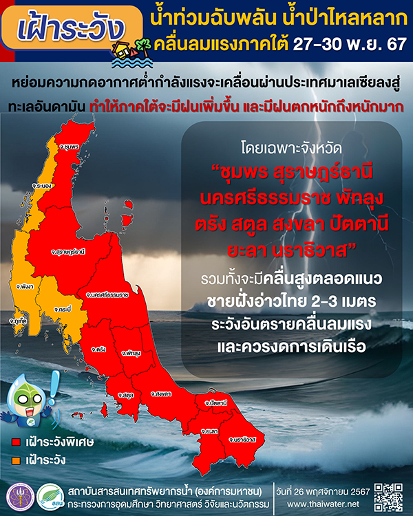 27-30 พ.ย. 67 เฝ้าระวัง น้ำท่วมฉับพลัน น้ำป่าไหลหลาก และคลื่นลมแรงพื้นที่ภาคใต้