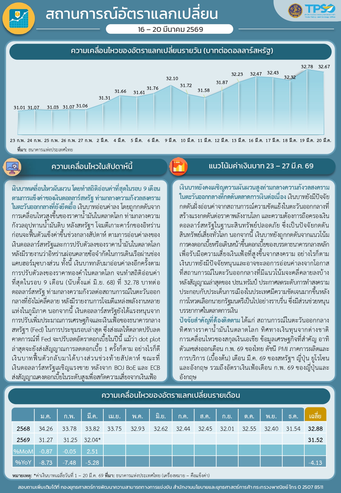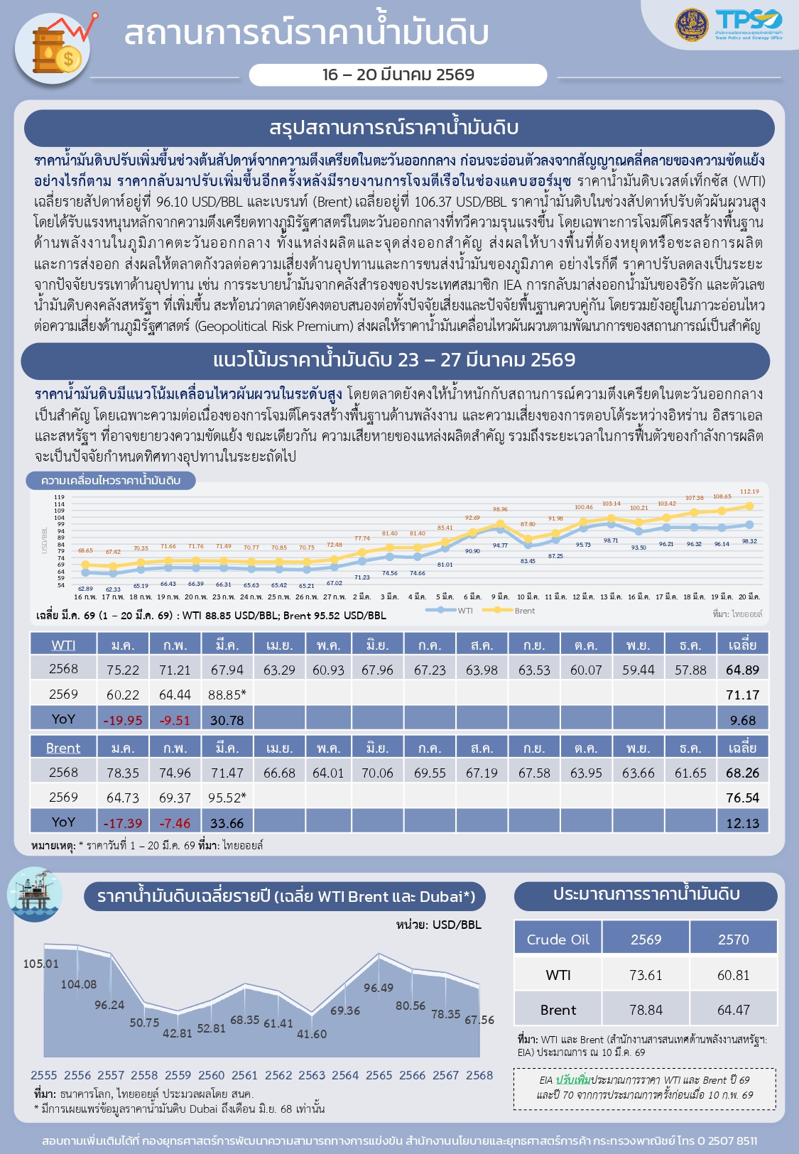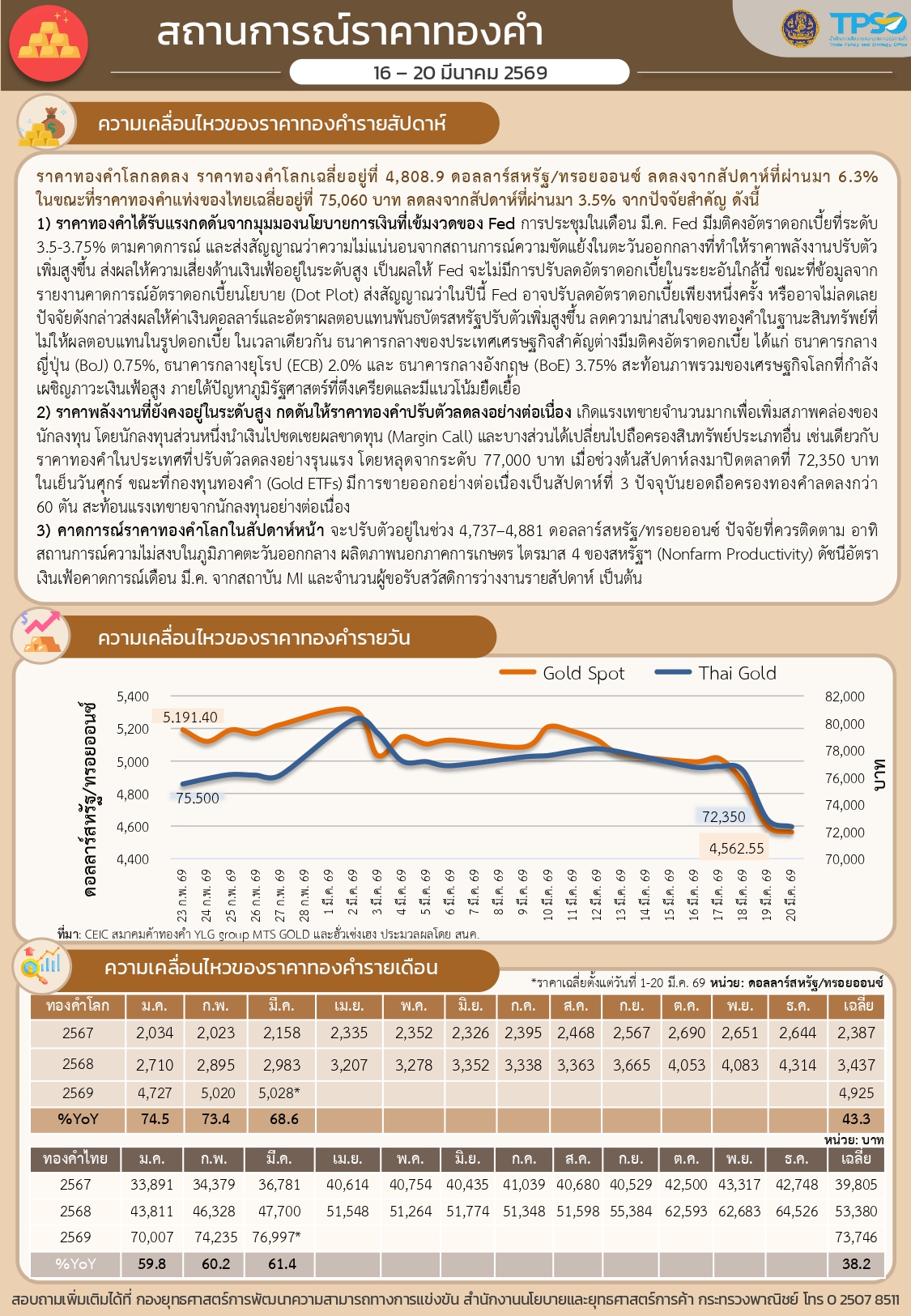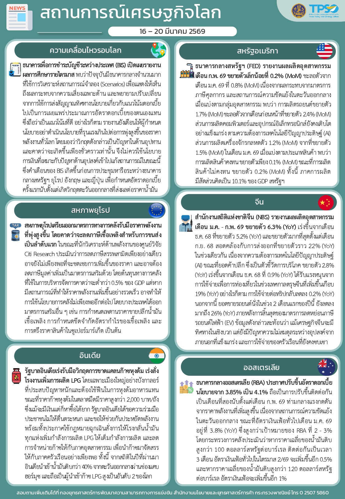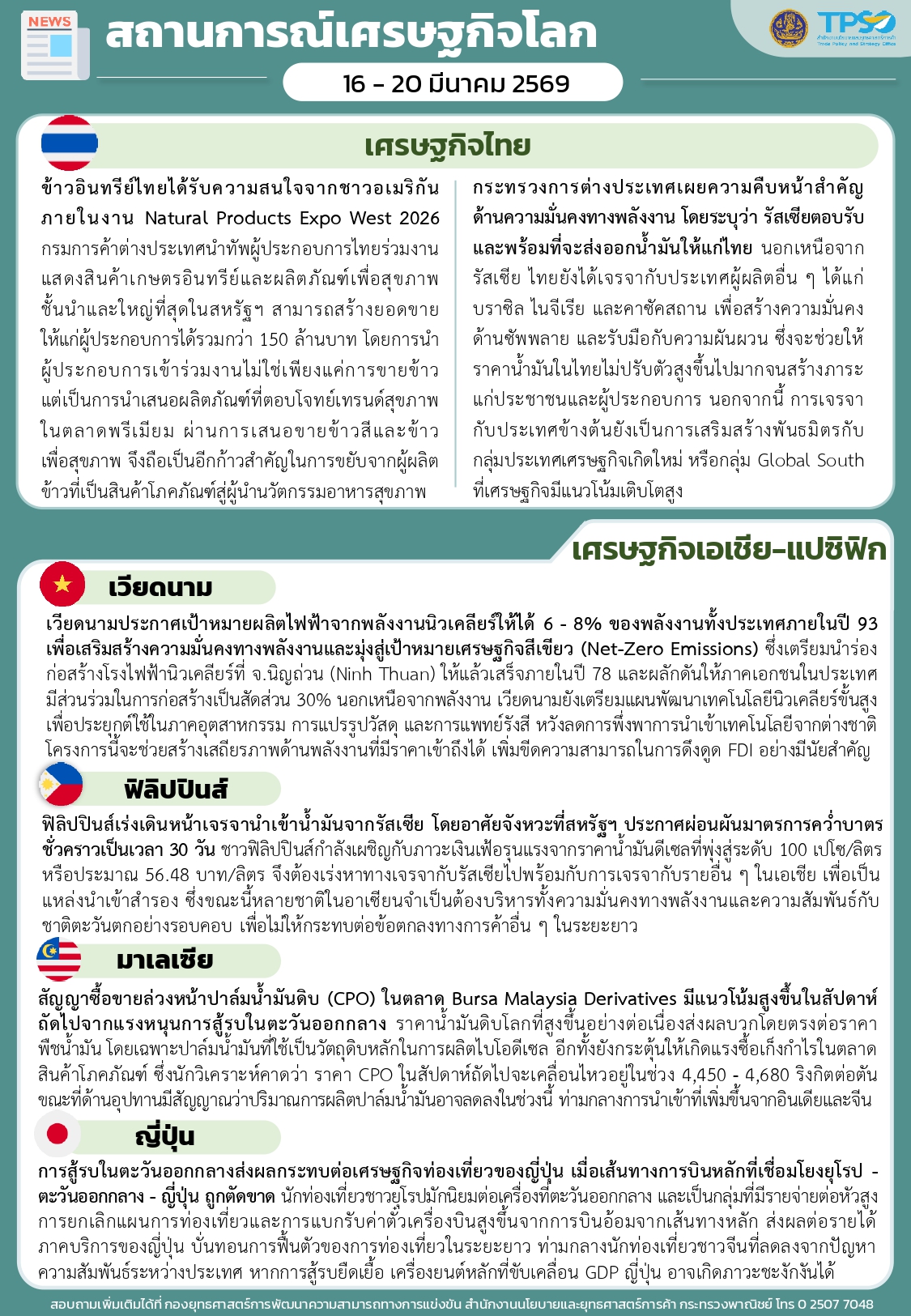 สรุปสถานการณ์เศรษฐกิจการค้าสำคัญ ประจำสัปดาห์ 16 - 20 มีนาคม 2569