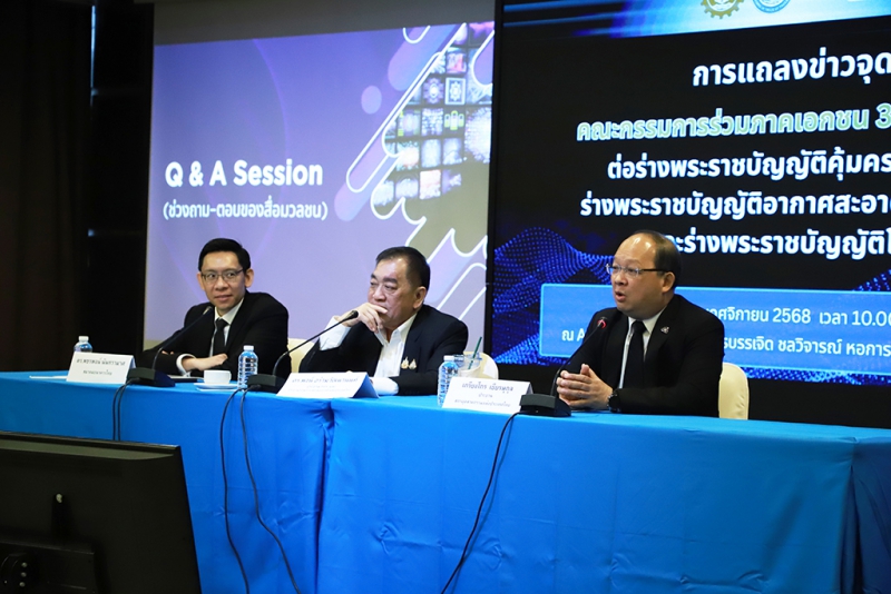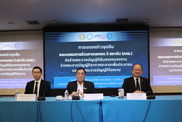วันนี้ (12 พฤศจิกายน 2568) คณะกรรมการร่วมภาคเอกชน 3 สถาบัน (กกร.) ประกอบด้วยสภาหอการค้าแห่งประเทศไทย สภาอุตสาหกรรมแห่งประเทศไทย และสมาคมธนาคารไทย แถลงจุดยืนต่อร่างกฎหมายสำคัญ 3 ฉบับ ได้แก่ 1) ร่างพระราชบัญญัติคุ้มครองแรงงาน (ฉบับที่ ..) พ.ศ. … 2) ร่างพระราชบัญญัติบริหารจัดการเพื่ออากาศสะอาด พ.ศ. … และ 3) ร่างพระราชบัญญัติโรงงาน (ฉบับที่ ..) พ.ศ. …