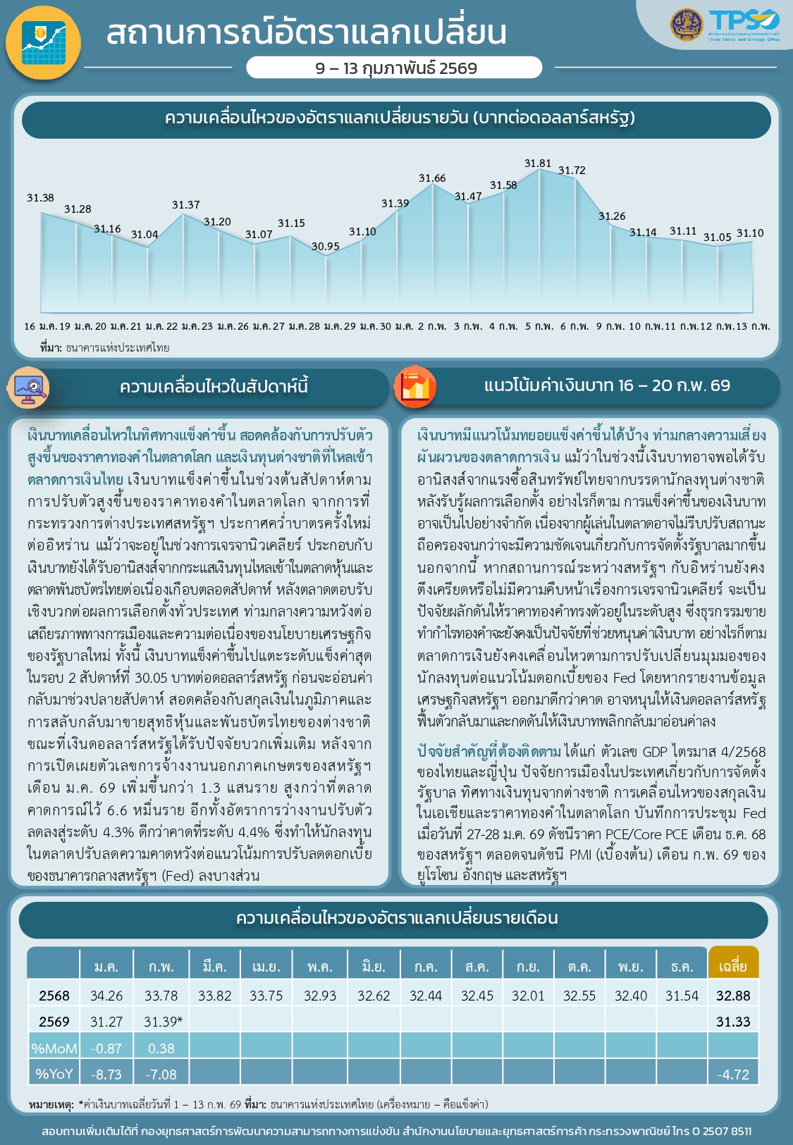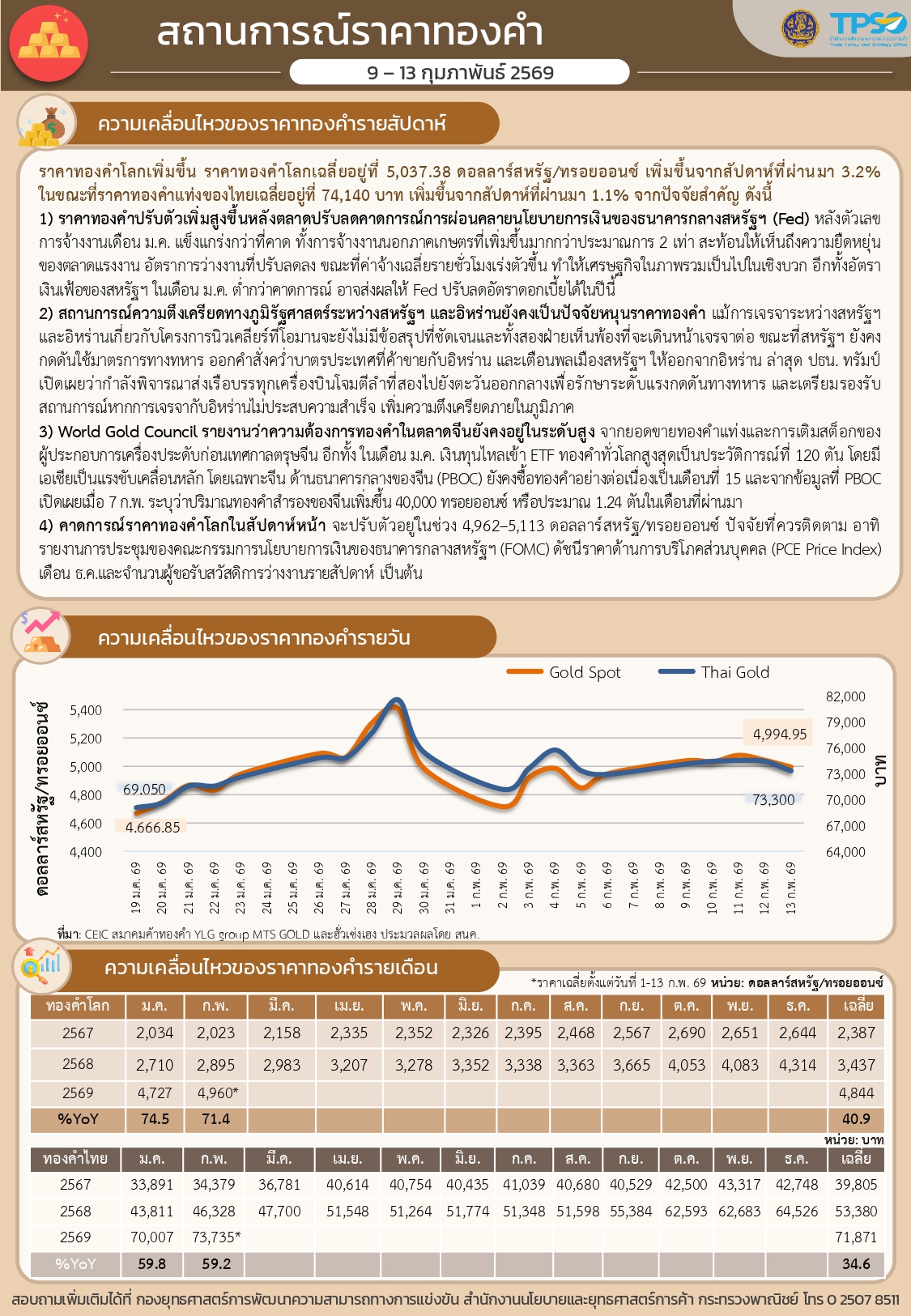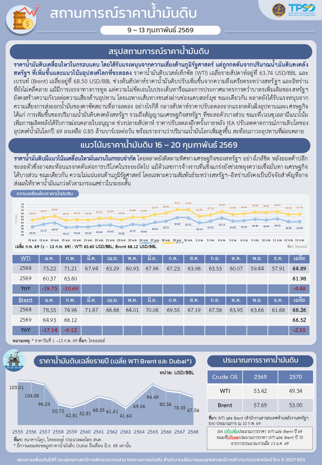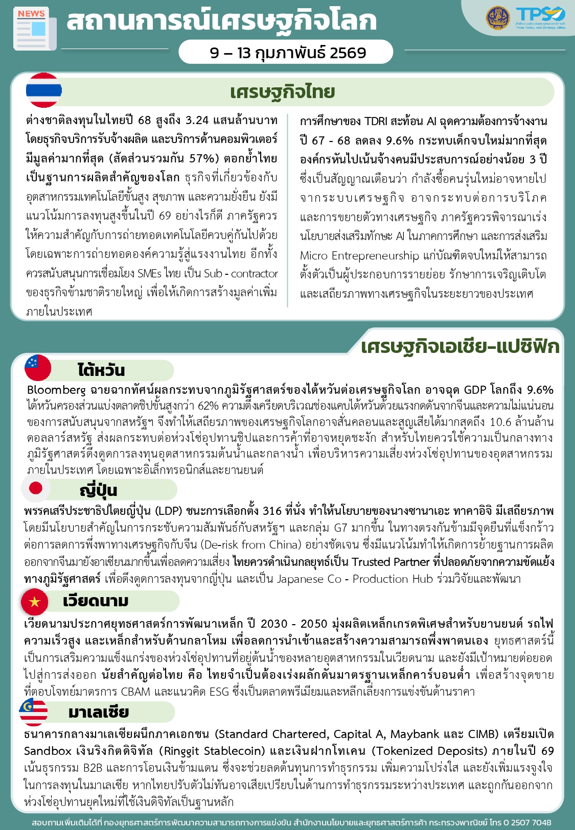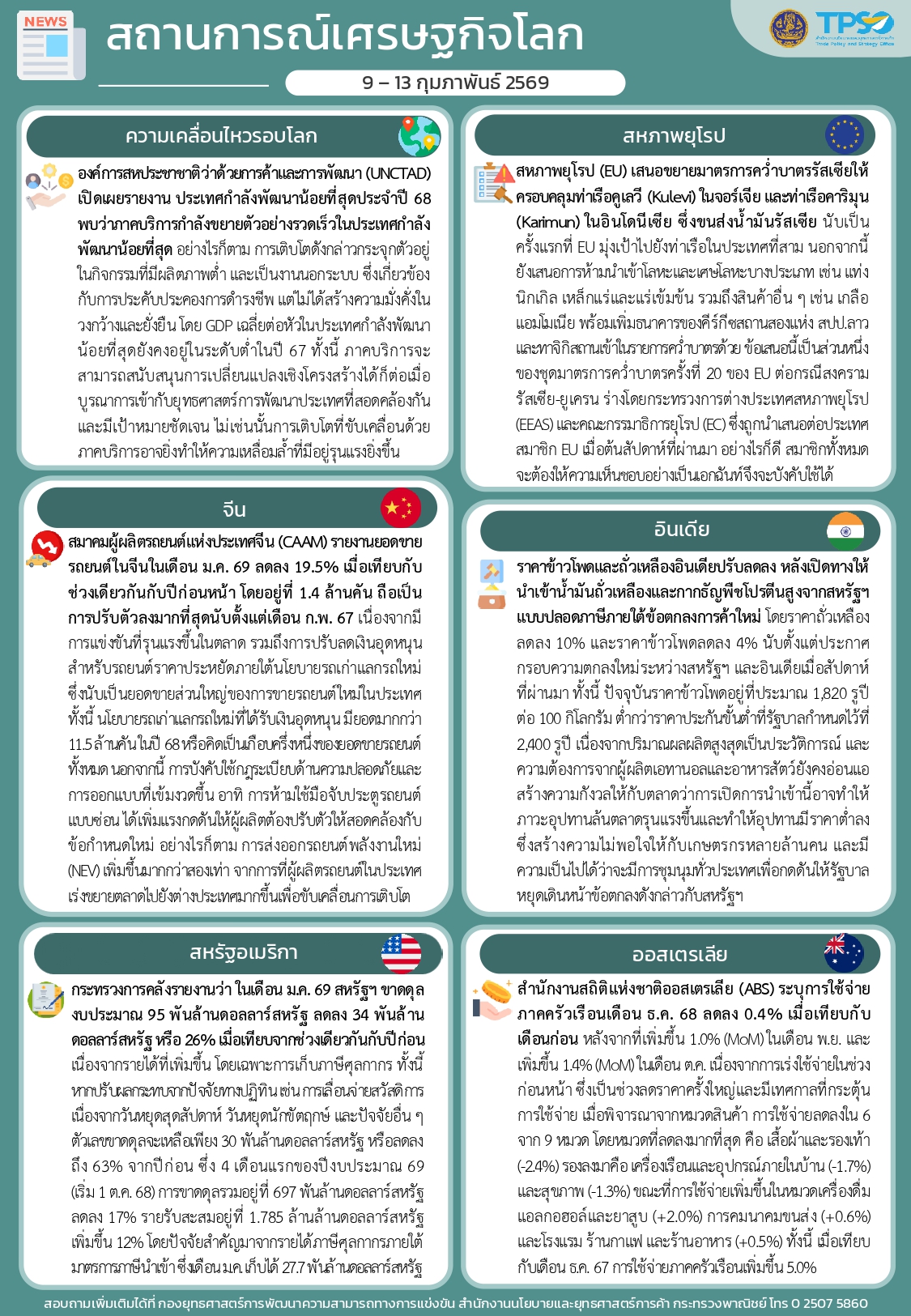 สรุปสถานการณ์เศรษฐกิจการค้าสำคัญ ประจำสัปดาห์ 9 - 13 กุมภาพันธ์ 2569