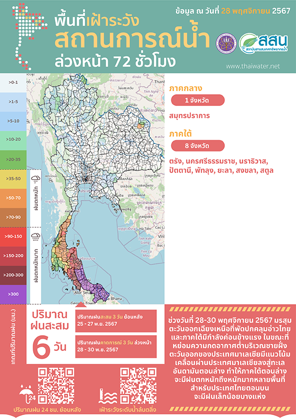 เฝ้าระวัง ภาคใต้มีฝนตกเพิ่มขึ้นและมีฝนตกหนักถึงหนักมากโดยเฉพาะจังหวัดชุมพร สุราษฏ์ธานี นครศรีธรรมราช ตรัง สตูล สงขลา ปัตตานี ยะลา นราธิวาส ช่วงวันที่ 28 - 30 พ.ย. 67 อาจส่งผลให้เกิดน้ำท่วมฉับพลันและน้ำป่าไหลหลากในพื้นที่ลาดเชิงเขา และน้ำท่วมขังจากฝนตกสะสมในพื้นที่เขตเมือง