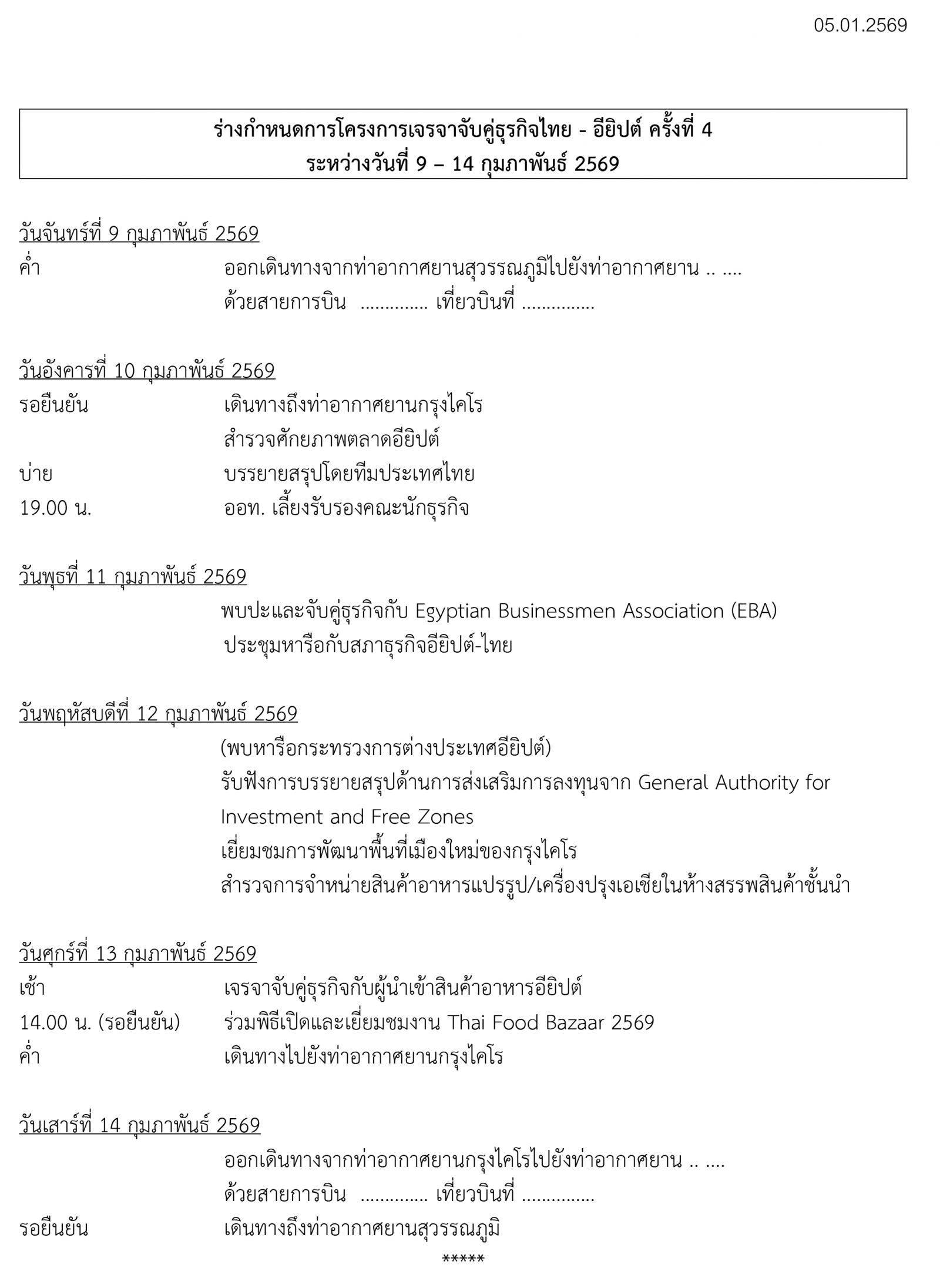 ประชาสัมพันธ์ ขอเชิญเข้าร่วมโครงการพานักธุรกิจไทยเดินทางเยือนอียิปต์ ระหว่างวันที่ 10-14 กุมภาพันธ์ 2569 ณ กรุงไคโร ประเทศอียิปต์