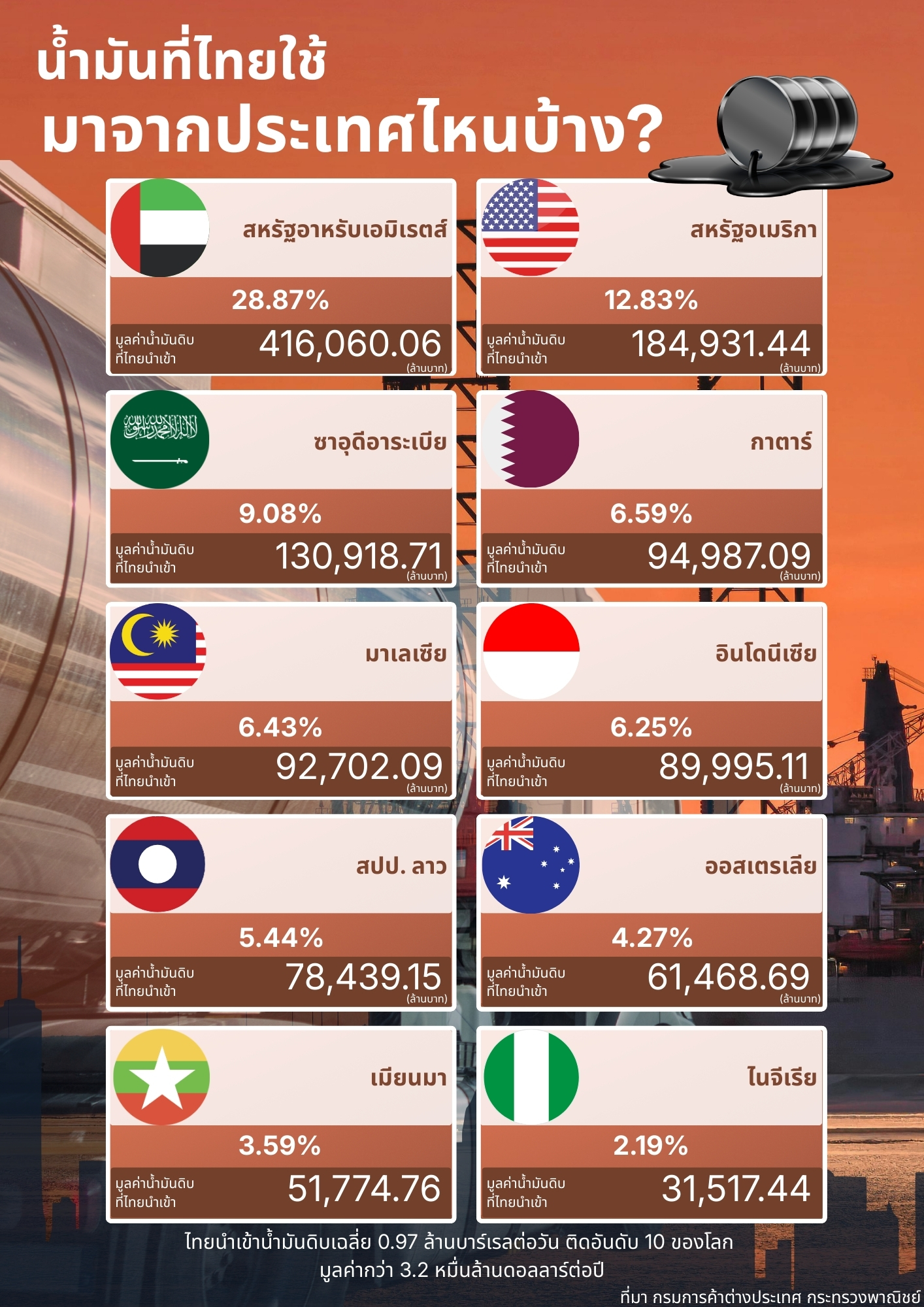 ไทยนำเข้าน้ำมันดิบจากที่ไหนมากที่สุด? เปิด 10 ประเทศคู่ค้าพลังงานหลักของไทย