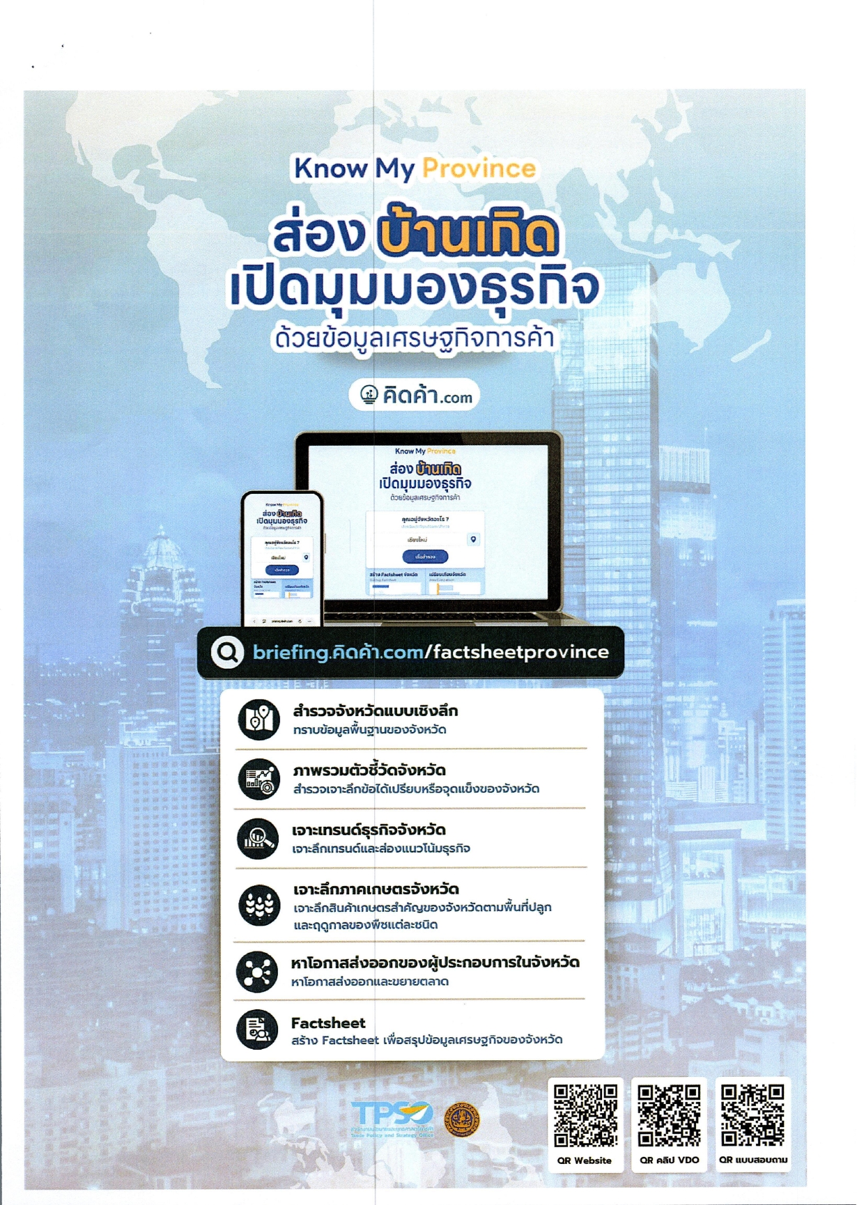 เพื่อให้บริการข้อมูลเศรษฐกิจการค้าเชิงลึกแก่ประชาชน หน่วยงานภาครัฐ และภาคเอกชน ผ่านเว็บไซต์ คิดค้า.com โดย สนค. ได้พัฒนาเว็บไซต์ฯ นำเสนอข้อมูลในรูปแบบ Data Storytelling ในปี 2568 ได้จัดทำเนื้อหาข้อมูลเศรษฐกิจการค้าระดับจังหวัด หัวข้อ “คิดค้า Briefing ส่องบ้านเกิด เปิดมุมมองธุรกิจ ด้วยข้อมูลเศรษฐกิจการค้า” ซึ่งนำเสนอข้อมูลเศรษฐกิจการค้าสำคัญของจังหวัด เช่น ตัวชี้วัดทางสังคมและเศรษฐกิจ สินค้าเกษตรสำคัญ โอกาสทางธุรกิจทั้งภายในจังหวัดและการส่งออกตลาดต่างประเทศ และ ข้อมูลการค้าไทย-สหรัฐฯ รายรัฐ ทั้งนี้ สามารถเข้าใช้งานได้ที่ QR Code